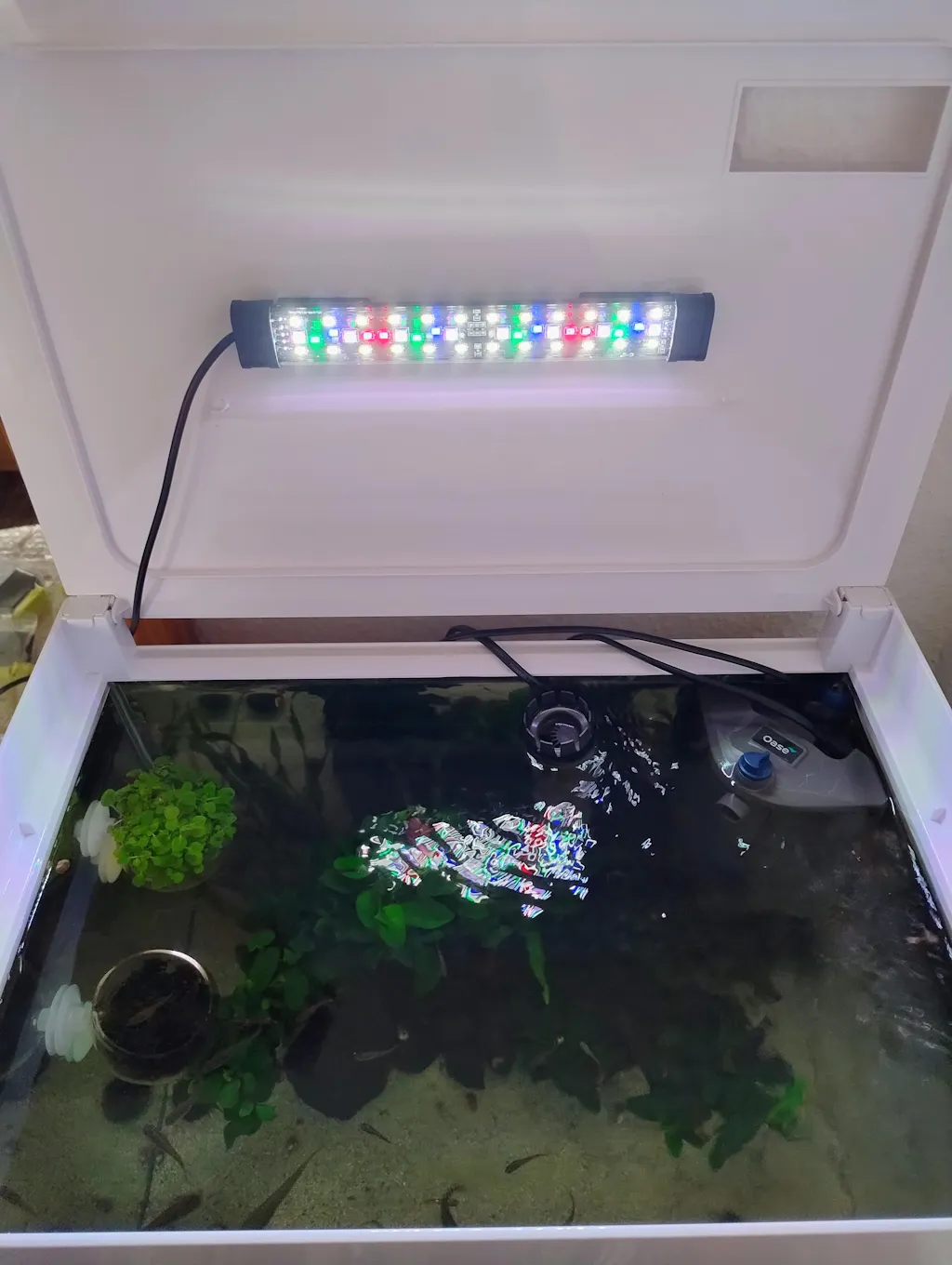 Untere, Innere, hintere abdeckung, stört Kabel, LED Lampe schlecht, die beiden Teile entfernen. Freie Kabel und andere LED innere Abdeckung zu befestigen. Filtergehäuse zu schwach und entfernt. Hintergrund sehe ich Bild nicht richtig, zu dunkel. Später werde ich mich Hintergrundbild entfernen und kaufe ich eine andere Juwel Hintergrund Bild und bessere Klebefilm für neue Hintergrundbild. Ansonsten Aquarium Gehäuse in Ordnung..